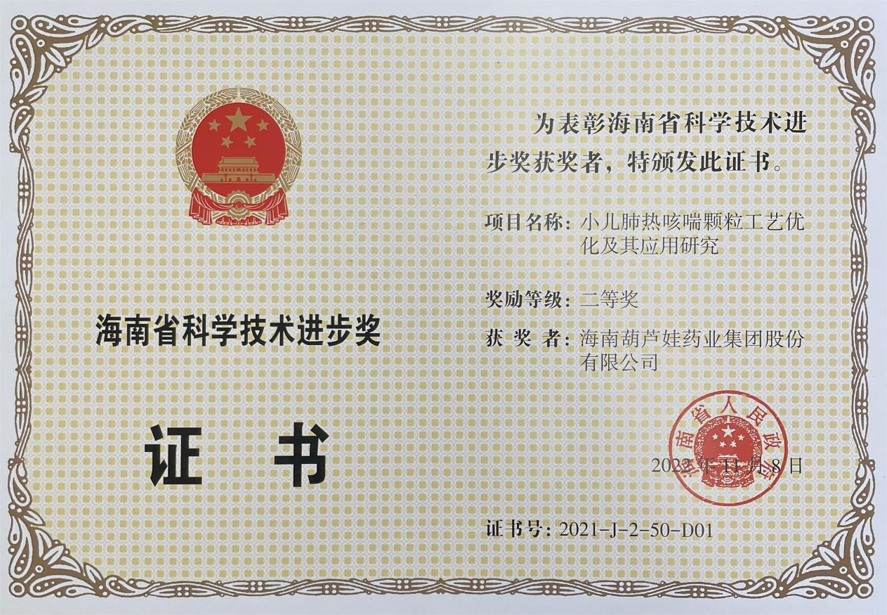 为此,小儿肺热咳喘颗粒的制备方法获得了第二十一届中国专利优秀奖(2019年),专利申请号:ZL201010134951,此次作为专利技术的应用,获得了2021年度海南省科学技术进步奖二等奖。在此之前,PA旗舰厅牌小儿肺热咳喘颗粒还多次被授予“临床价值中成药品牌”、“中国连锁药店最具合作价值单品”,荣登“中国医药品牌榜”。